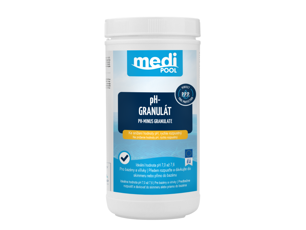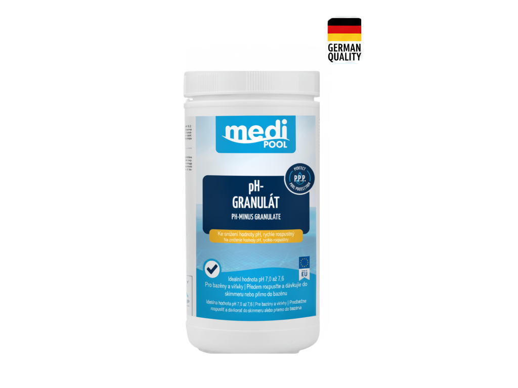 Hodnota pH je klíčovým faktorem kvality bazénové vody – ovlivňuje účinnost dezinfekce, komfort při koupání i životnost bazénové technologie. Pokud je pH příliš vysoké, dochází ke snížení účinnosti chloru, zakalení vody i tvorbě usazenin. mediPOOL pH-MINUS GRANULÁT zajišťuje přesné a stabilní snížení pH, čímž vytváří ideální podmínky pro čistou, bezpečnou a dokonale vyváženou vodu v bazénech i vířivkách.