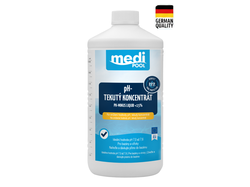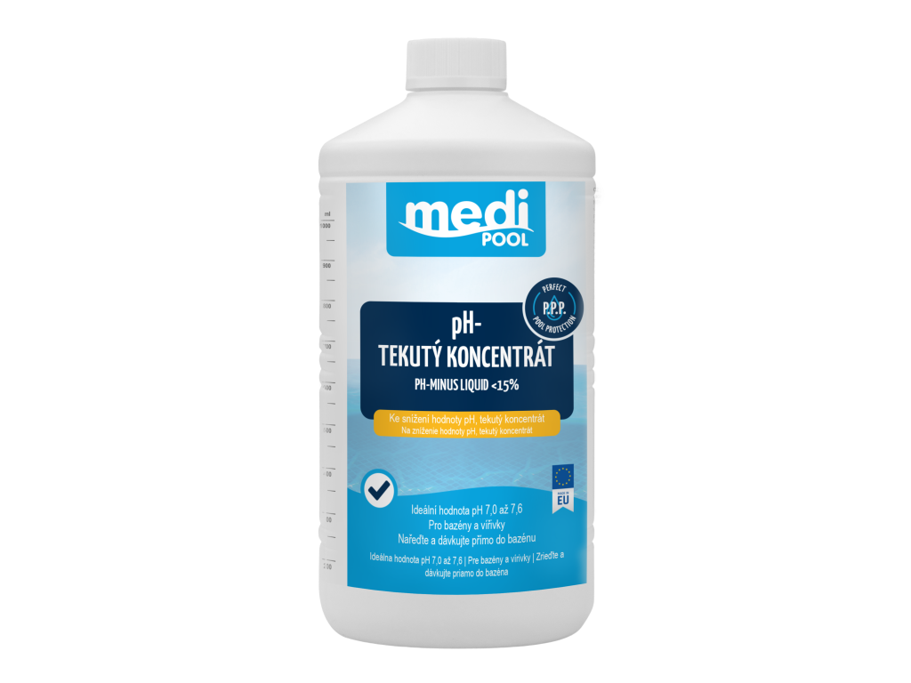 Hodnota pH zásadně ovlivňuje kvalitu bazénové vody – při jejím zvýšení dochází ke snížení účinnosti dezinfekce, tvorbě zákalu i usazenin. mediPOOL pH-MINUS TEKUTÝ představuje moderní a efektivní řešení pro rychlé snížení pH a okamžitou stabilizaci vody. Díky tekuté formě se přípravek ihned mísí s vodou, což umožňuje přesnější dávkování, rychlejší reakci a maximální komfort při použití – ideální zejména pro automatické dávkovací systémy i náročnější provoz bazénů a vířivek.