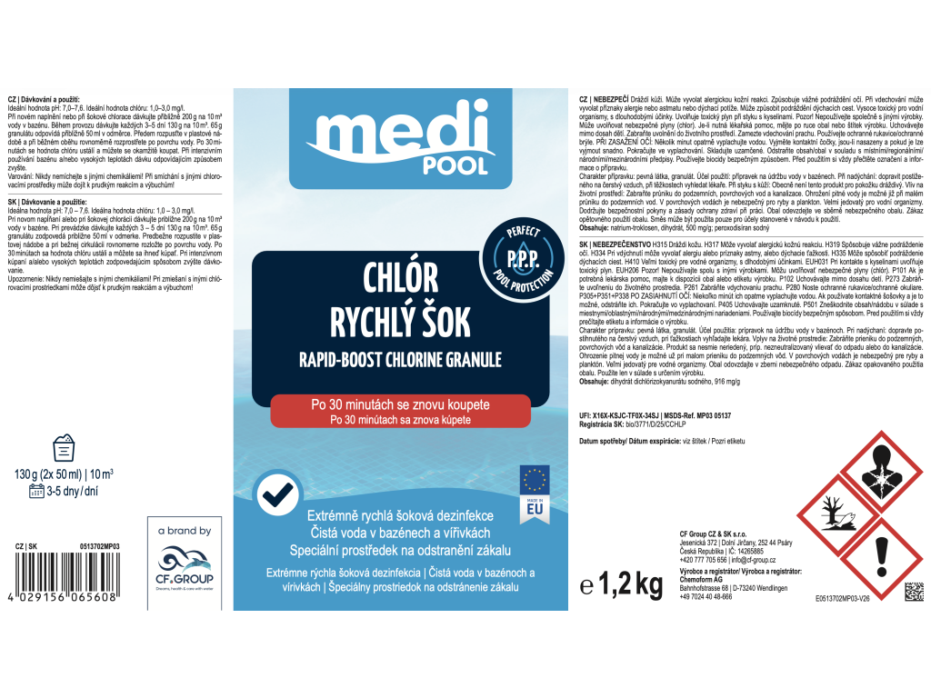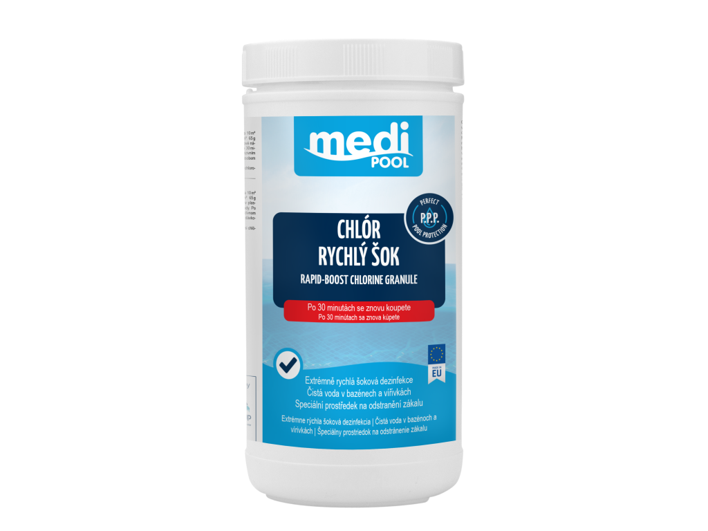 mediPOOL Rapid-BOOST chlorový granulát představuje moderní a vysoce účinné řešení pro okamžitou dezinfekci bazénové vody. Díky kombinaci chlóru a aktivního kyslíku působí rychleji a efektivněji než běžné chlorové přípravky, což z něj dělá ideální volbu pro náročné uživatele. Granulát se velmi rychle rozpouští a ihned začíná likvidovat bakterie, viry, řasy a další mikroorganismy. Zároveň účinně odstraňuje zákal, organické nečistoty i nepříjemný zápach vody. Velkou výhodou tohoto produktu je možnost koupání již krátce po aplikaci – přibližně za 15–30 minut, kdy se hladina chlóru stabilizuje. To představuje zásadní rozdíl oproti běžným chloršokovým přípravkům, které vyžadují mnohem delší odstávku bazénu. Produkt je vhodný jak pro šokové ošetření (např. po napuštění bazénu nebo při zhoršení kvality vody), tak pro pravidelnou údržbu během sezóny. Je kompatibilní se všemi typy bazénů i vířivek.