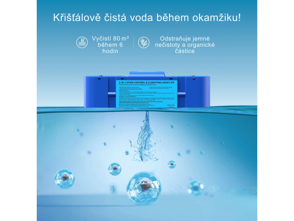 Přírodní 3v1 projasňovač vody je prémiová sada pro komplexní péči o vodu ve vašem bazénu, navíc oproti základní sadě obsahuje účinné složky, které odstraňují kovové ionty a chrání bazén před vodním kamenem a korozí. Obsahuje ekologické a biologicky rozložitelné složky získané ze schránek mořských korýšů (především chitosan), které efektivně projasní vodu a chrání filtrační systém i další vybavení bazénu.