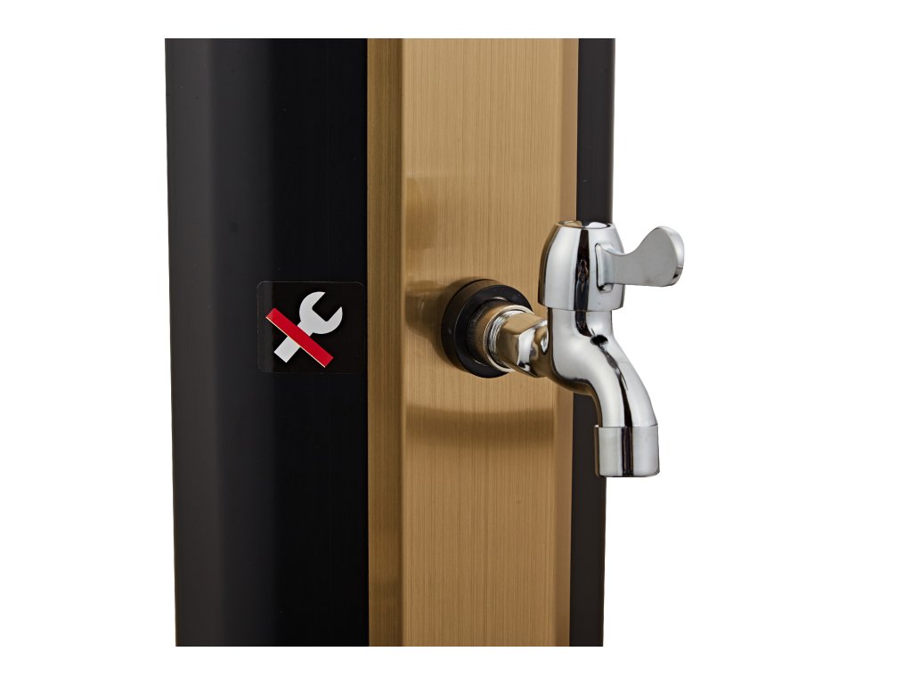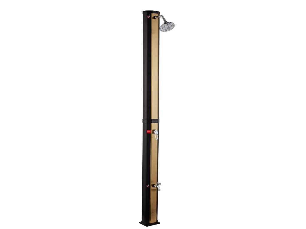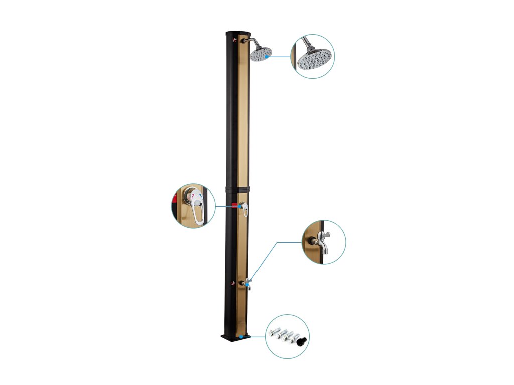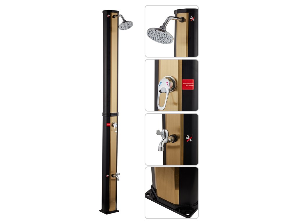 Solární sprcha NEOVA Korfu 35L v černo-zlatém provedení je perfektním doplňkem každé zahrady, terasy nebo okolí bazénu. Díky svému modernímu designu a ekologickému fungování bez potřeby elektřiny nabízí komfortní osvěžení a šetří náklady na energii. Tato sprcha využívá solární energii k ohřevu vody až na 60°C, což je ideální pro letní dny, kdy chcete mít k dispozici teplou vodu bez jakéhokoli zásahu do elektrické sítě.
