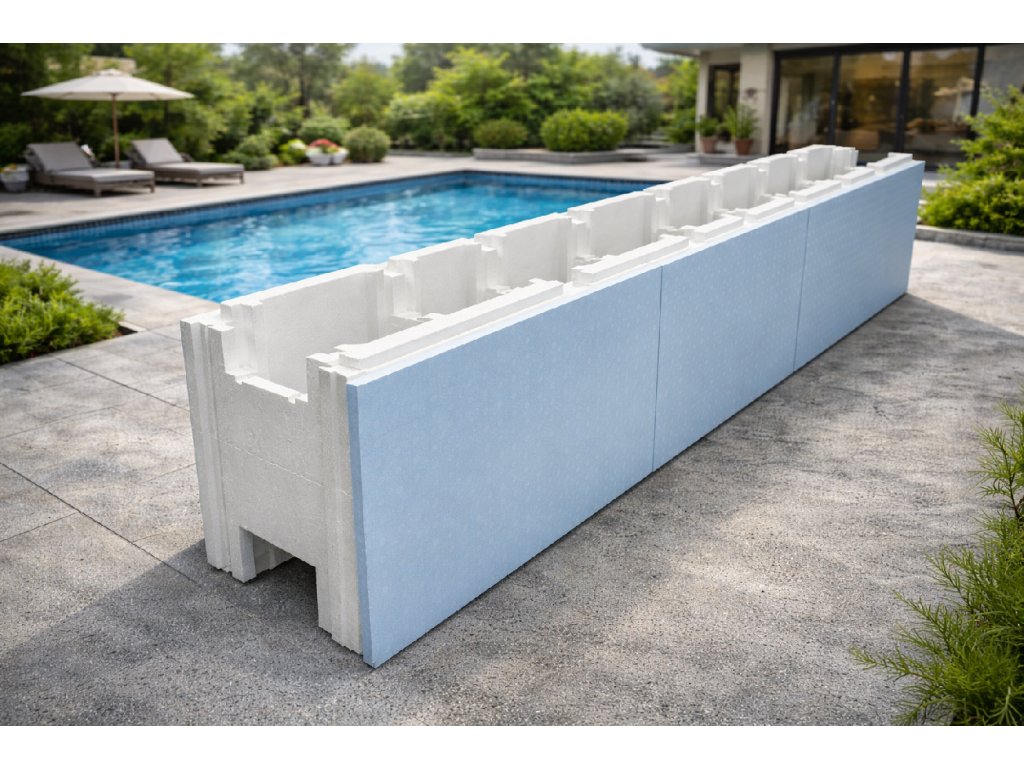Velmi vysoká hustota na straně tvárnice: 80 kg/m3 - pomáhá odolávat tlakům na stěnách bazénu