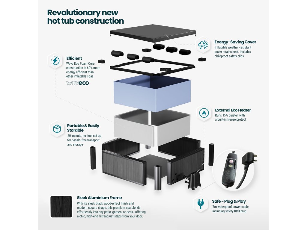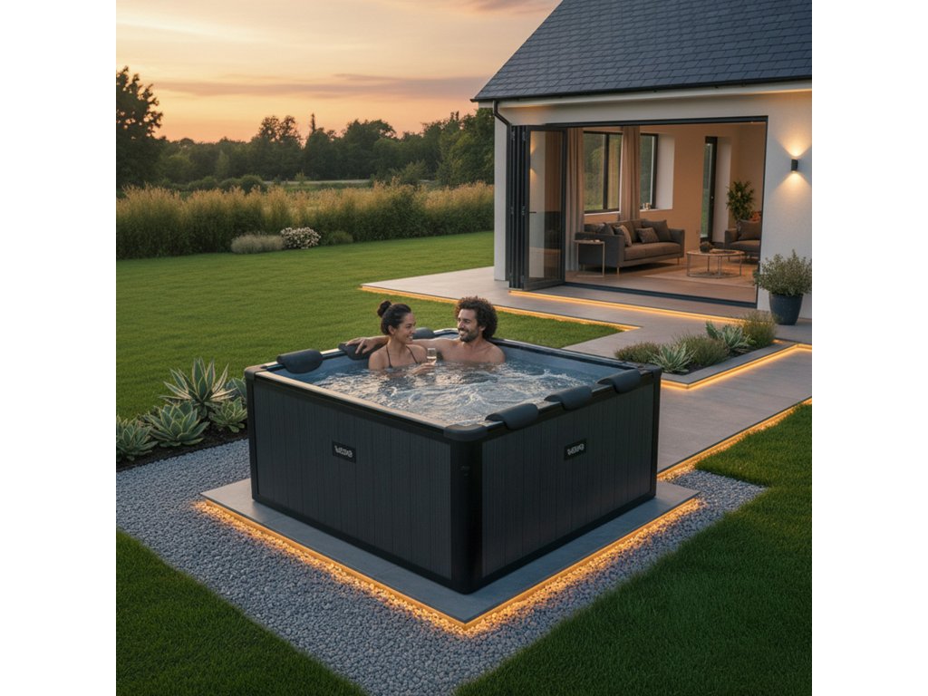 Elegantní čtvercový design s efektem černého dřeva se stává dominantou každé zahrady nebo terasy. Díky svému tvaru navíc dokonale využívá prostor – žádná hluchá místa jako u kulatých vířivek.