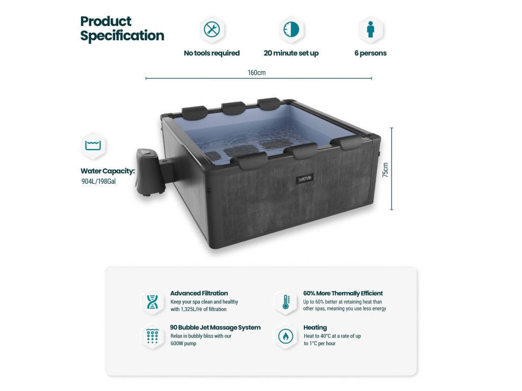 Díky výkonnému ohřevu dosáhne voda teploty až 40 °C a systém ji udržuje stabilní i při delším používání. Ovládání je maximálně jednoduché – buď přímo na panelu, nebo přes mobilní aplikaci díky WiFi připojení.